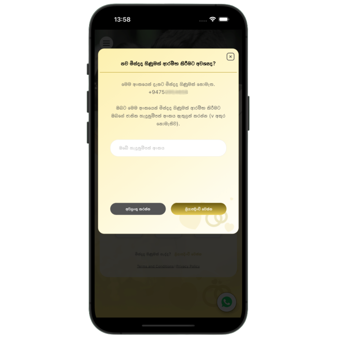• මීලගට දිස්වෙන popup එකේ ඔබගේ ජාතික හැදුනුම්පත් අංකය සටහන් කර යොමු කරන්න button එක මත click කරන්න.