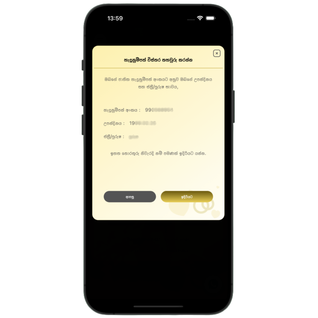 • ඔබගේ ජාතික හැදුනුම්පත් අංකයට අනුව ඔබගේ උපන්දිනය සහ ස්ත්‍රී/පුරුෂ භාවය,උපන් දිනය නිවැරදි නම් පමණක් ඉදිරියට යන්න Button එක මත click කරන්න.